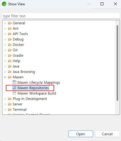 팝업된 Show View 대화상자에서 아래와 같이 Maven Repositories를 선택합니다.