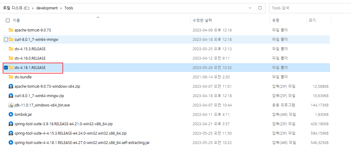 압축 해제가 완료되면 sts-4.18.1.RELEASE 디렉토리가 생성되었음을 확인할 수 있습니다.