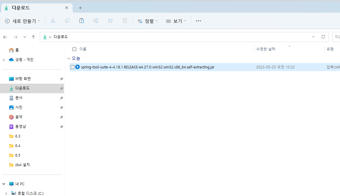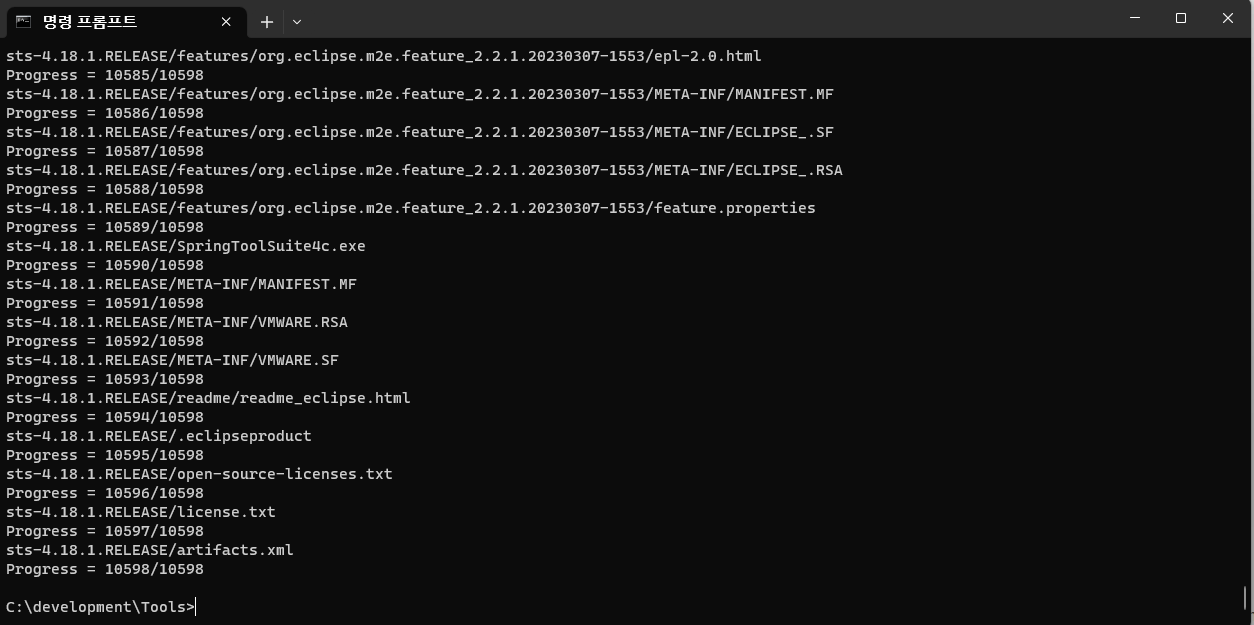 위 그림처럼 커맨드 실행이 완료되면,spring-tool-suite-4-4.18.1.RELEASE-e4.27.0-win32.win32.x86_64.self-extracting.jar 파일이 위치한 경로에,sts-4.18.1.RELEASE 디렉토리가 생성되었음을 확인할 수 있습니다.