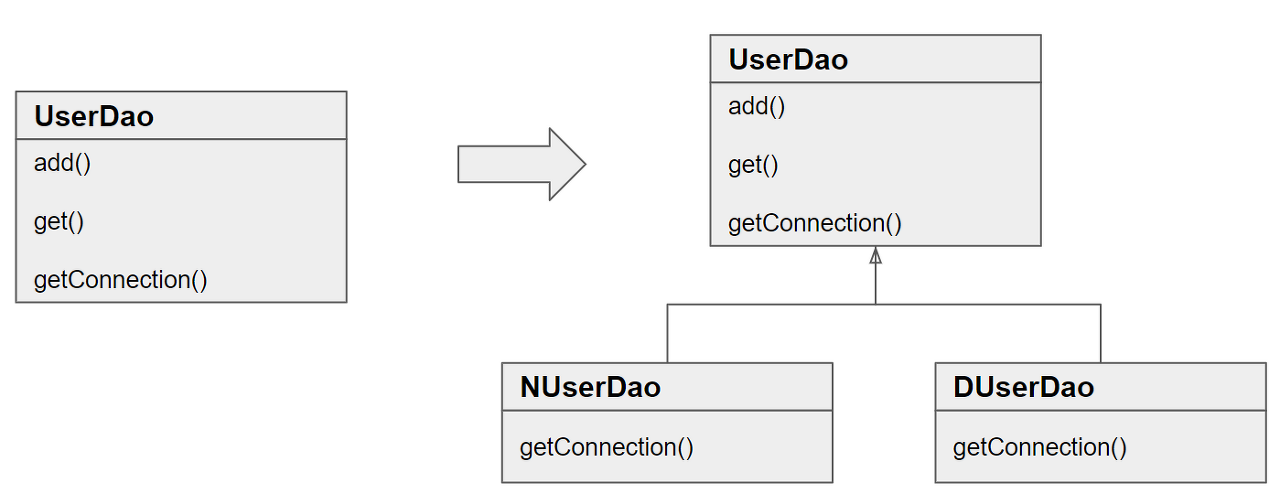 UserDao 클래스를 추상 클래스로 전환한 후, NUserDao와 DUserDao 같은 구체적인 하위 클래스들이 이를 상속받아서 사용하는 새로운 구조가 도입되었습니다. 이러한 변경은 하위 클래스들이 `getConnection()` 메소드를 자신들의 필요에 맞게 구현할 수 있는 유연성을 제공합니다.