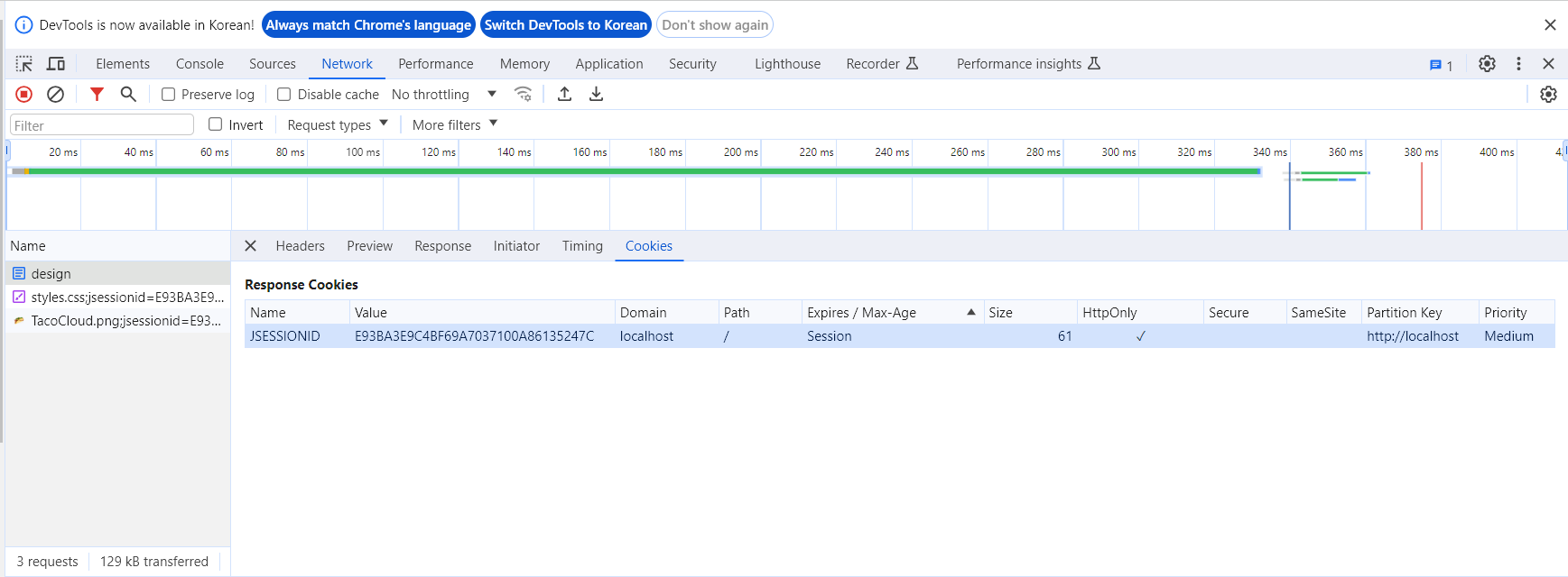 세션 쿠키는 Expires 또는 Max-Age 속성이 없기 때문에 브라우저가 닫힐 때 삭제됩니다.