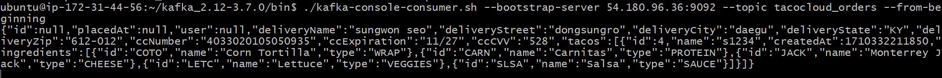 ./kafka-console-consumer.sh --bootstrap-server 54.180.96.36:9092 --topic tacocloud_orders --from-beginning
