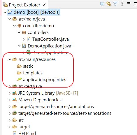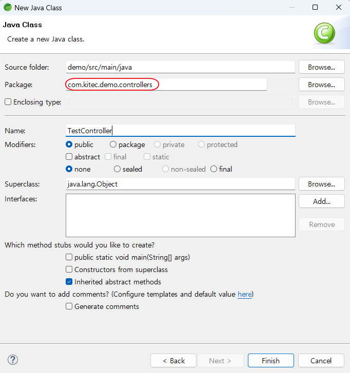 controllers 패키지를 추가하고 TestController.java를 생성.